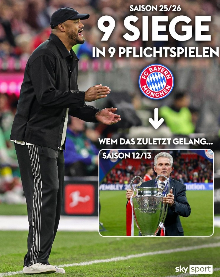 Bayern đã giành được chín chiến thắng liên tiếp trong tất cả các cuộc thi mùa này. Lần cuối cùng đội đạt được trong mùa giải 12/13. Vào thời điểm đó, Heinx đã huấn luyện đội bóng và cuối cùng đã giành được chức vô địch Bundesliga, Cup Đức và Champions League, đạt được thành tích ba nhà vô địch đầu tiên trong lịch sử câu lạc bộ.
