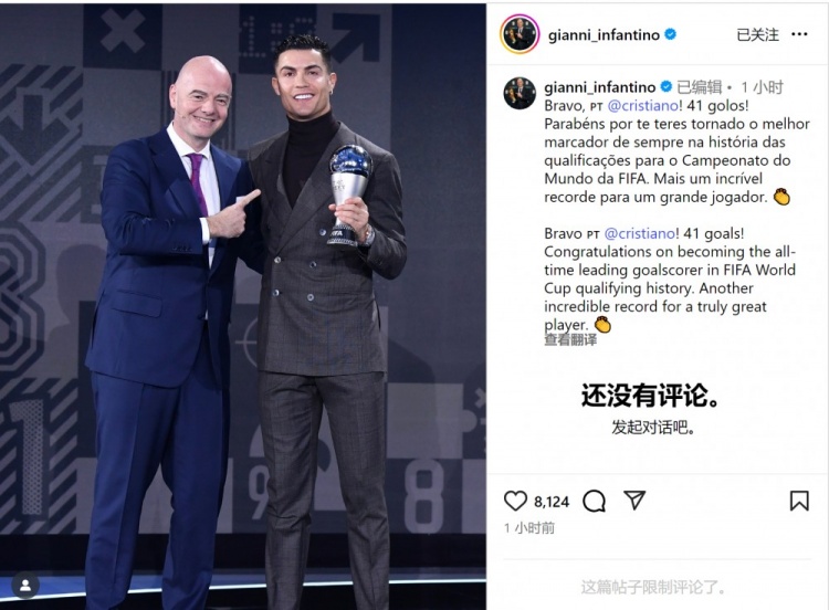 Infantino viết: "Tuyệt vời, Ronaldo! 41 bàn thắng! Chúc mừng bạn đã trở thành cầu thủ ghi nhiều bàn thắng nhất trong lịch sử vòng loại World Cup. Cầu thủ thực sự vĩ đại này một lần nữa đạt được kỷ lục phi thường."
